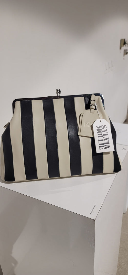 Red striped handbag with a visible brand logo on a white pedestal table.